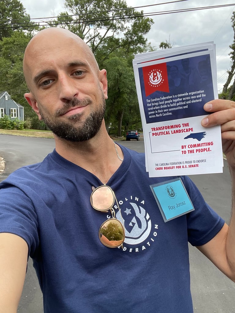 In 2021 and 2022, Galloway, Baker & Eurquhart had received money to conduct door-knocking activity in North Carolina for the 2022 election cycle, but they were having trouble getting started. As of July of 2022, they had no offices, supplies, or staff with any knowledge of what to do. This is when they were referred to Ray Jarosz via a former Bernie Sanders' campaign colleague of Ray's. The majority owner of Galloway, Baker & Eurquhart poured his heart out to Ray, and asked him to come to North Carolina. After a period of negotiation, a deal was reached, and Ray decided to temporarily move from Las Vegas to North Carolina for the 2022 election cycle.